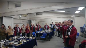 総会後、懇親会に移り、最近会員になった数人から自己紹介や近況報告があったほか、ケータリング会社の提供する料理、アルコールのほか、何人かから提供された日本酒、ワインなどを和気あいあいと楽しみました。各サークルの活動報告や勧誘などがあった後、「都の西北」と『紺碧の空』を肩を組み、腕を振って大声で歌って午後5時に散会しました。